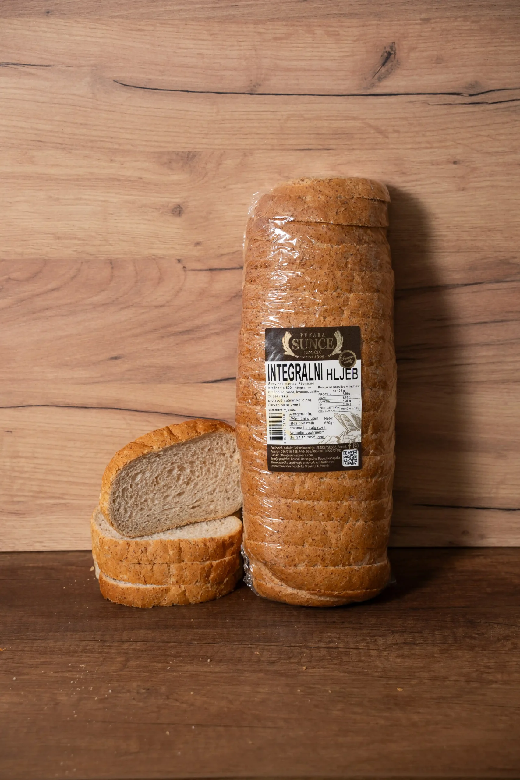 Pšenično brašno tip-500, integralno brašno mljevenjem čitavog zrna pšenice, so, voda, kvasac, aditiv za pekarsku proizvodnju (min. količina).