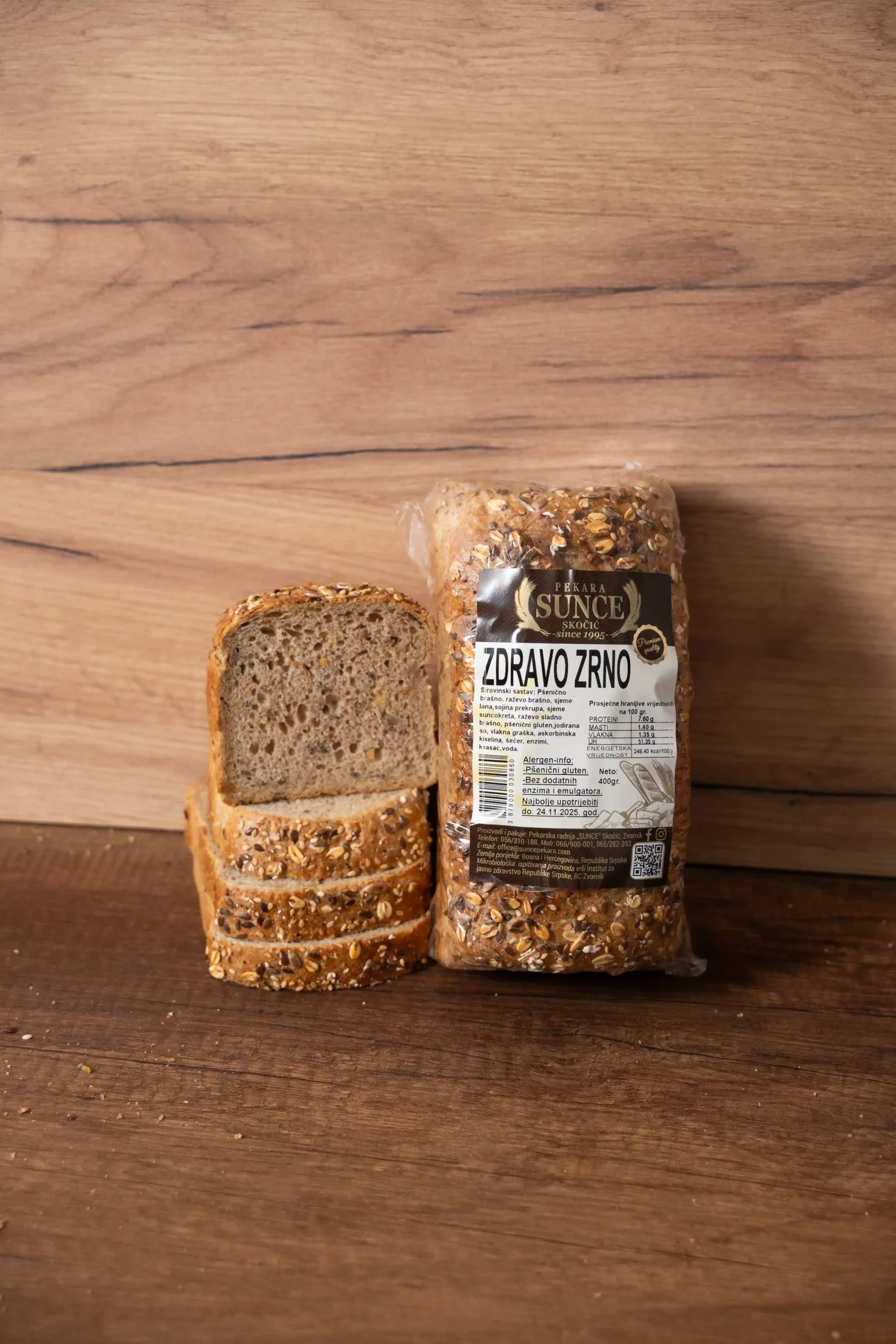 Sastojci: Pšenično brašno tip-500, sjeme lana, sjeme suncokreta, raževo brašno tip 1150, tostirana sojina krupica, zobene pahuljice, pšenične mekinje, sitna raža (5 %), ražena slatka, pšenični gluten, so, kiselo tijesto u prahu, sojino brašno, enzimi, zadnji sušeno koliandera